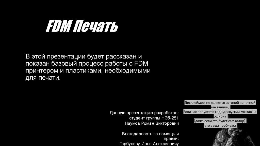 В этой презентации будет рассказан ипоказан базовый процесс работы с FDM
