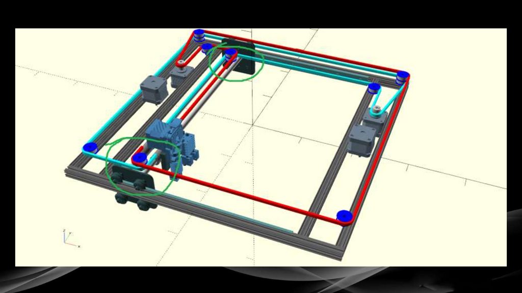 • Кинематика CoreXY работает за счет двух шаговиков, которые управляют двумя