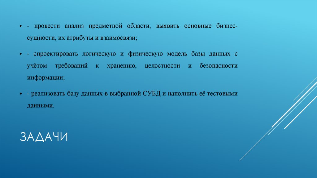 ▶- провести анализ предметной области, выявить основные бизнессущности, их атрибуты и взаимосвязи;