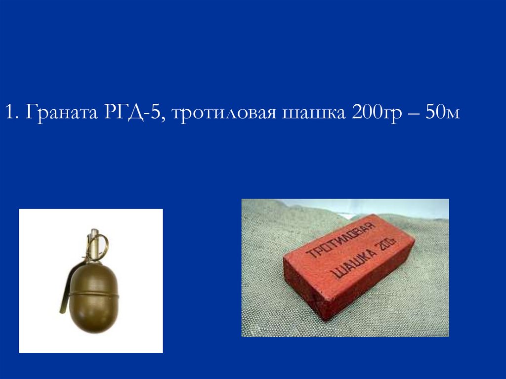 1. Граната РГД-5, тротиловая шашка 200гр – 50м5.