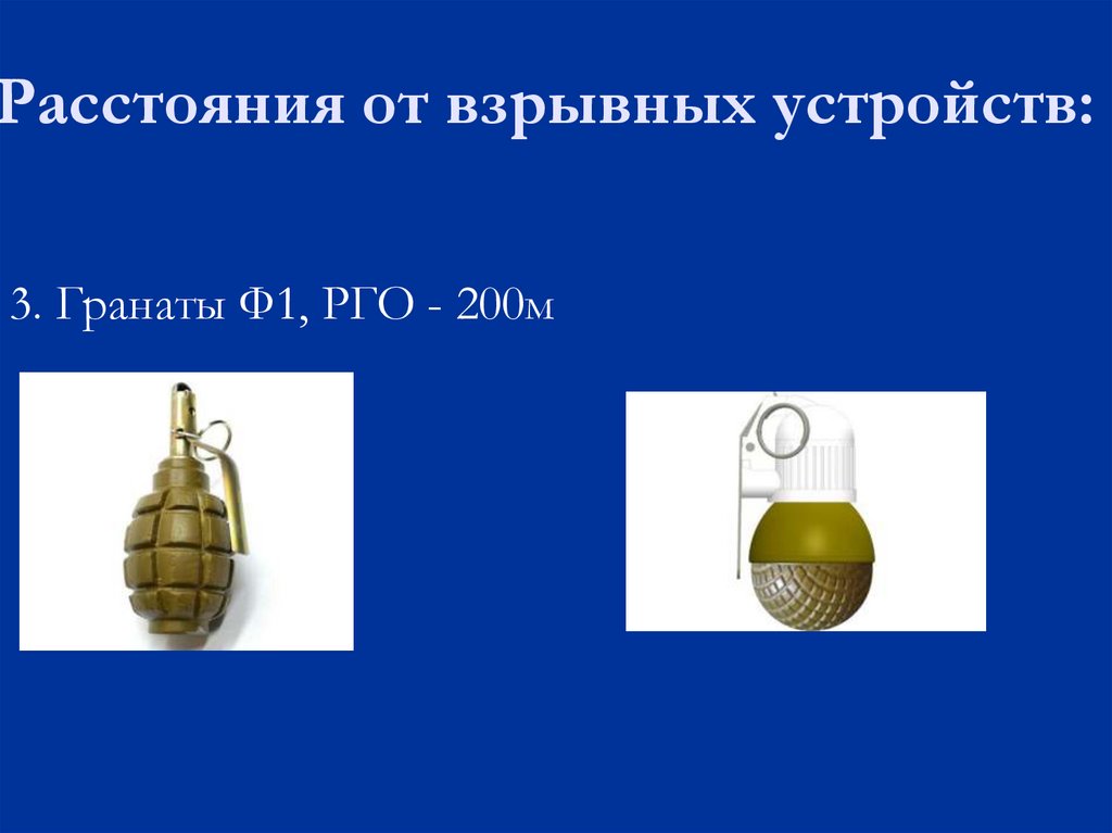 Расстояния от взрывных устройств:3. Гранаты Ф1, РГО - 200м