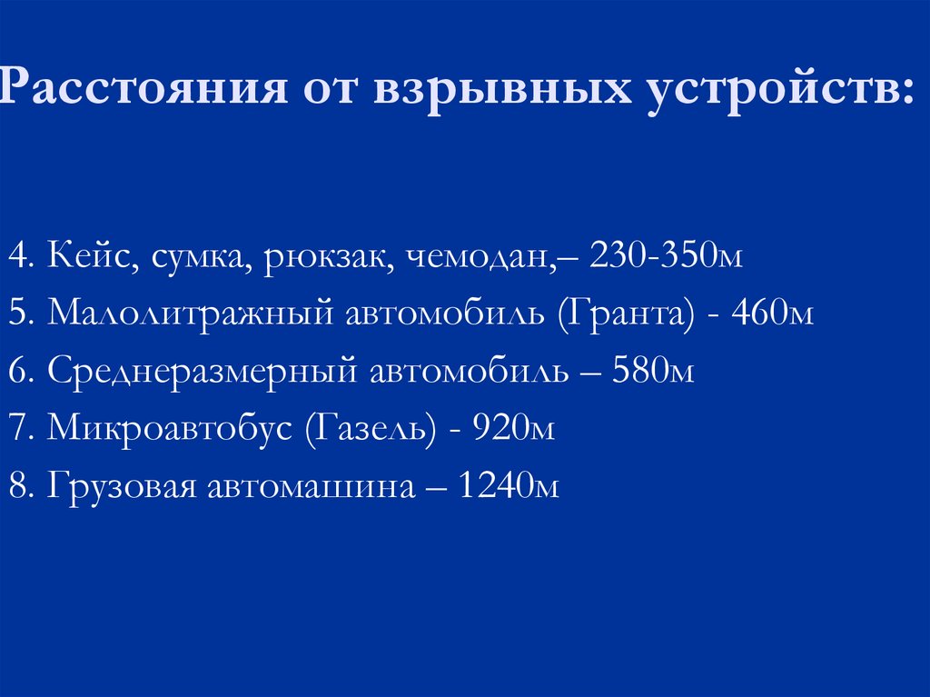 Расстояния от взрывных устройств:4. Кейс, сумка, рюкзак, чемодан,– 230-350м