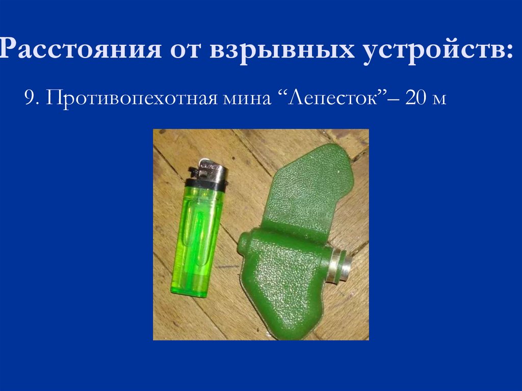 Расстояния от взрывных устройств:9. Противопехотная мина “Лепесток”– 20 м