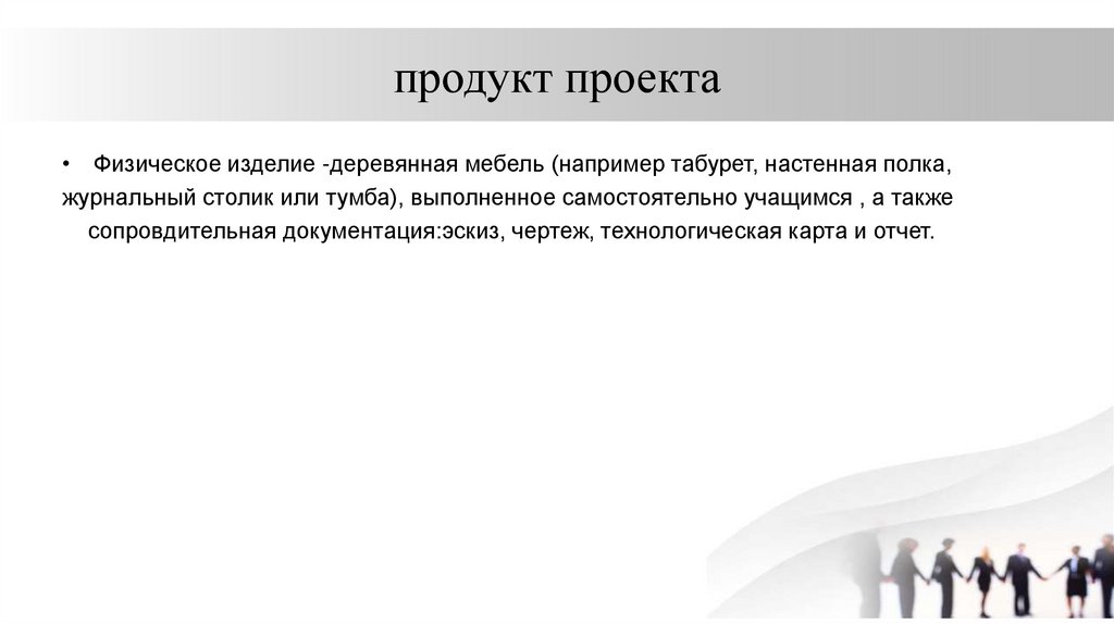 продукт проекта• Физическое изделие -деревянная мебель (например табурет, настенная полка,