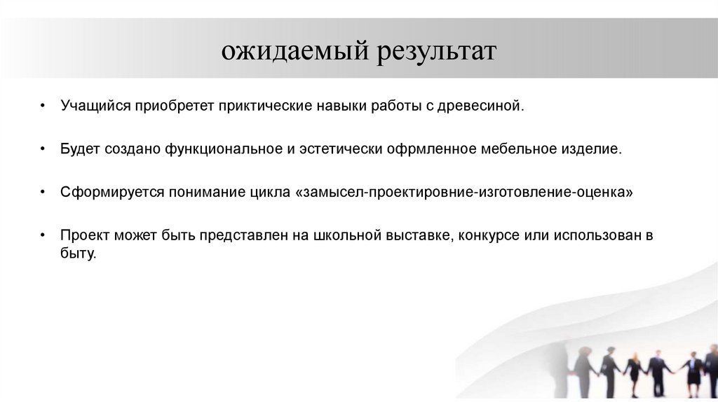 ожидаемый результат• Учащийся приобретет приктические навыки работы с древесиной.