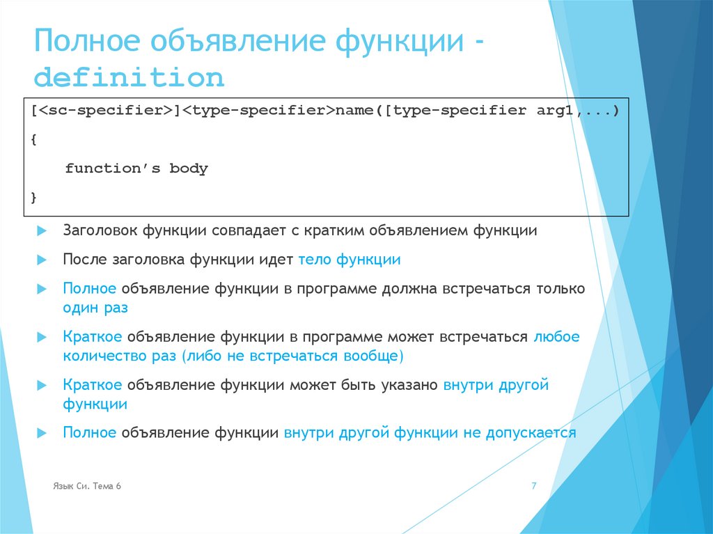 Полное объявление функции definition[<sc-specifier>]<type-specifier>name([type-specifier arg1,...)