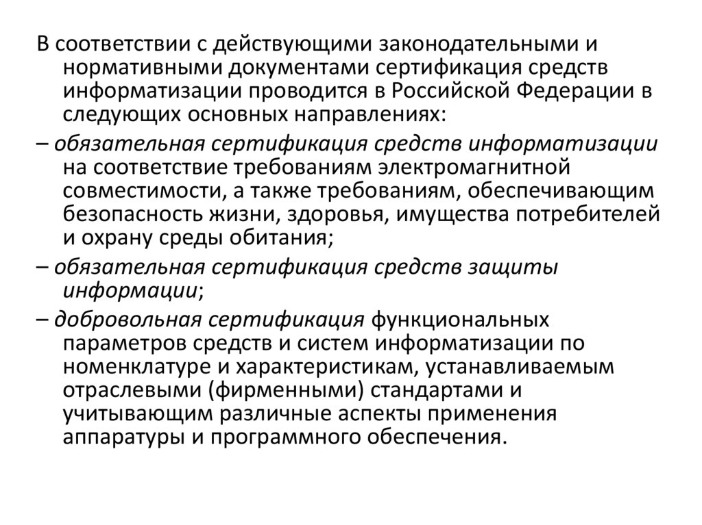 В соответствии с действующими законодательными инормативными документами сертификация средств