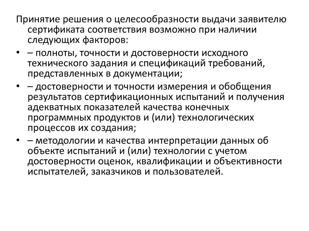 Принятие решения о целесообразности выдачи заявителюсертификата соответствия возможно при наличии