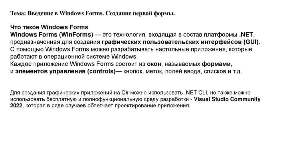 Тема: Введение в Windows Forms. Создание первой формы.Что такое Windows Forms