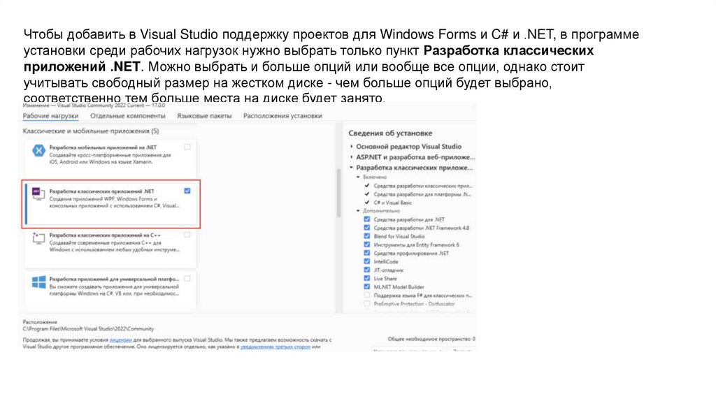 Чтобы добавить в Visual Studio поддержку проектов для Windows Forms и C# и .NET, в программеустановки среди рабочих нагрузок нужно выбрать только пункт Разработка классических