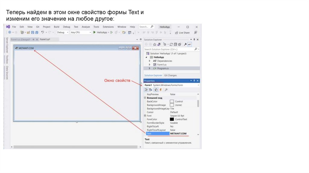 Теперь найдем в этом окне свойство формы Text иизменим его значение на любое другое: