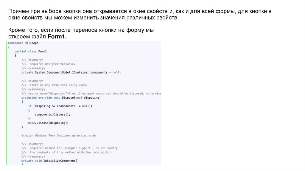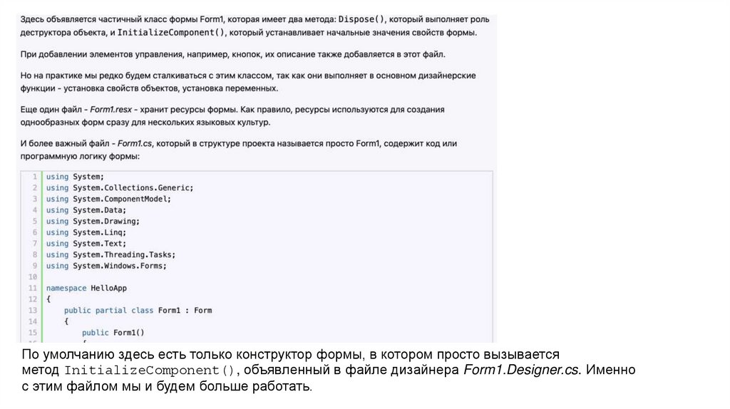 По умолчанию здесь есть только конструктор формы, в котором просто вызываетсяметод InitializeComponent(), объявленный в файле дизайнера Form1.Designer.cs. Именно
