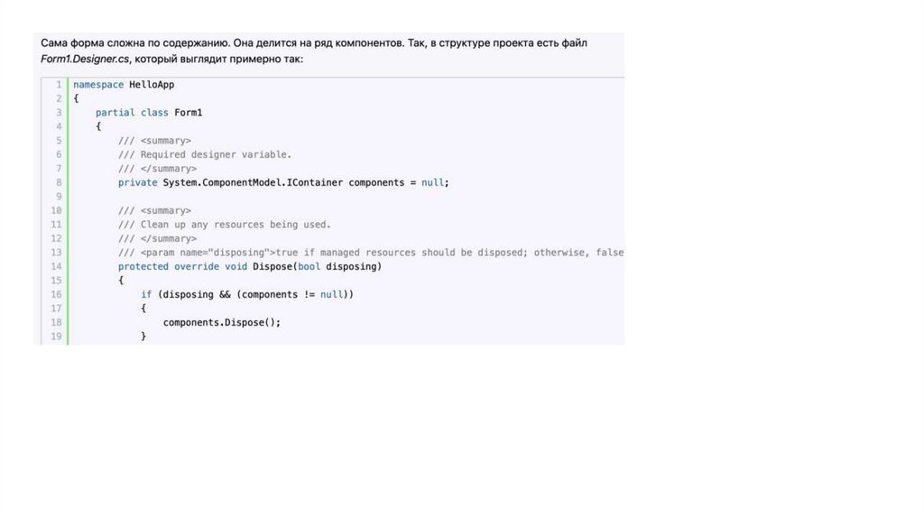 • Form1.Designer.cs: он содержит определение компонентов формы, добавленных на