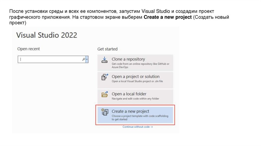После установки среды и всех ее компонентов, запустим Visual Studio и создадим проектграфического приложения. На стартовом экране выберем Create a new project (Создать новый