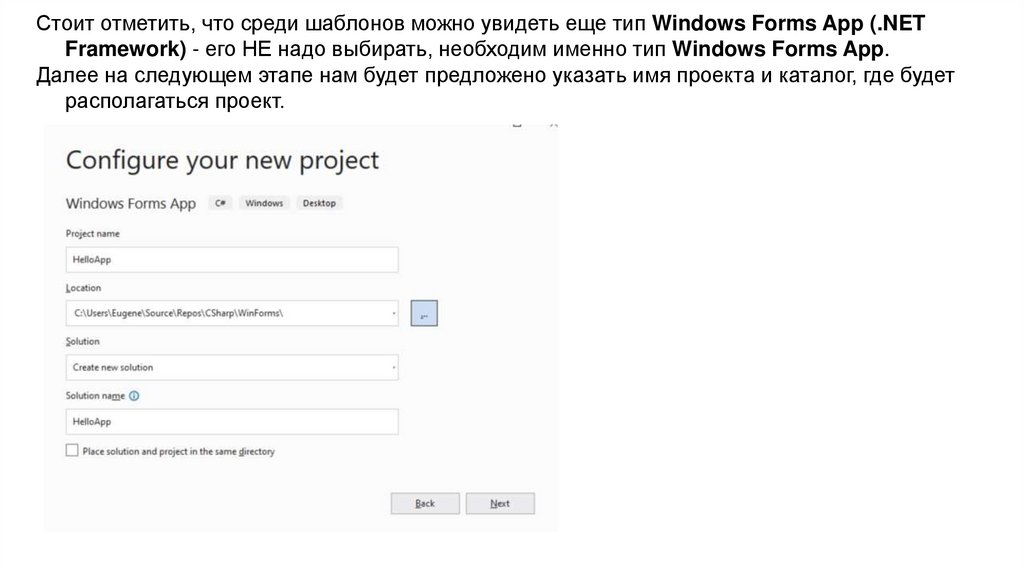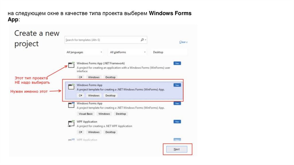 Стоит отметить, что среди шаблонов можно увидеть еще тип Windows Forms App (.NETFramework) - его НЕ надо выбирать, необходим именно тип Windows Forms App.