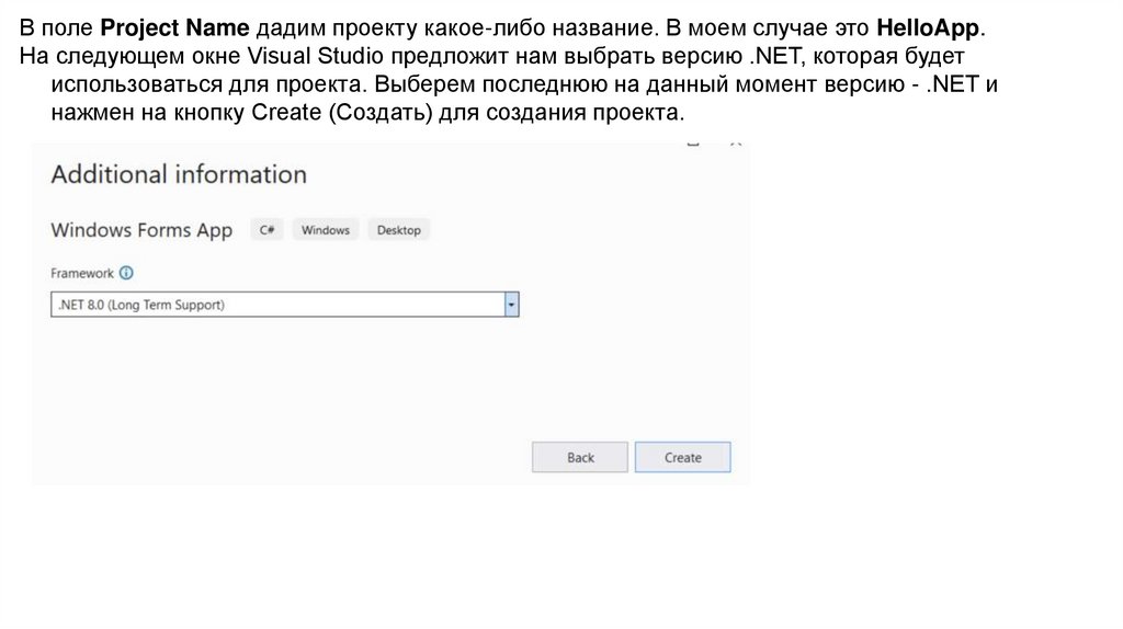 В поле Project Name дадим проекту какое-либо название. В моем случае это HelloApp.На следующем окне Visual Studio предложит нам выбрать версию .NET, которая будет