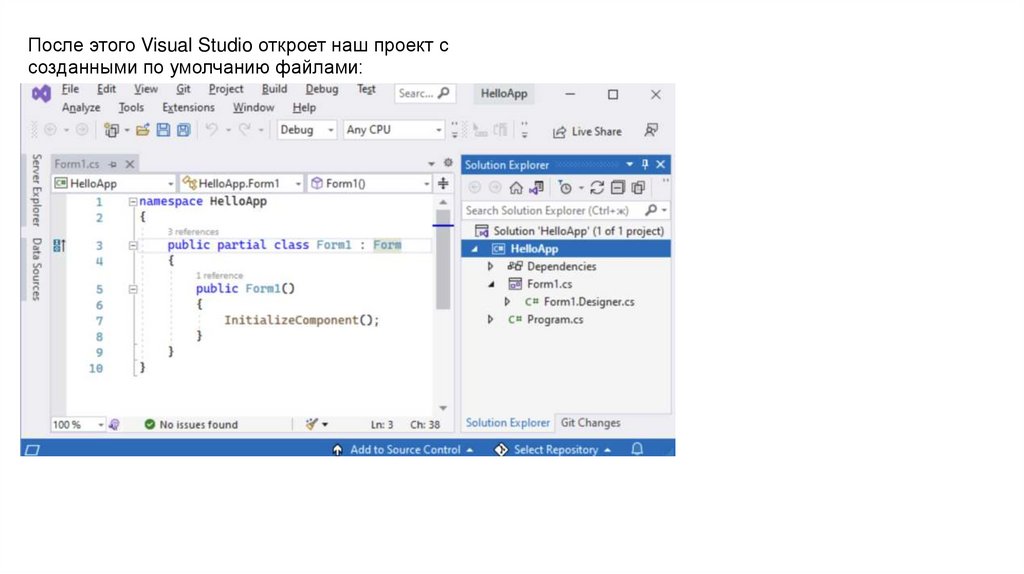 После этого Visual Studio откроет наш проект ссозданными по умолчанию файлами: