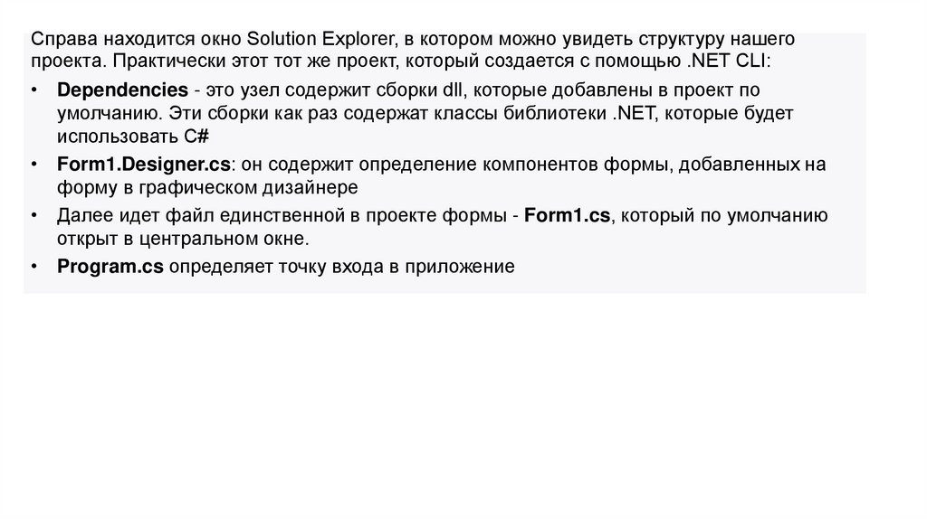 Справа находится окно Solution Explorer, в котором можно увидеть структуру нашегопроекта. Практически этот тот же проект, который создается с помощью .NET CLI: