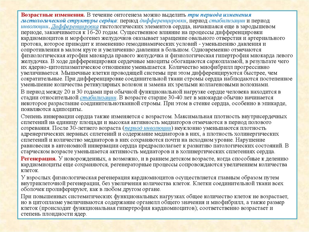 Возрастные изменения. В течение онтогенеза можно выделить три периода изменениягистологической структуры сердца: период дифференцировки, период стабилизации и период