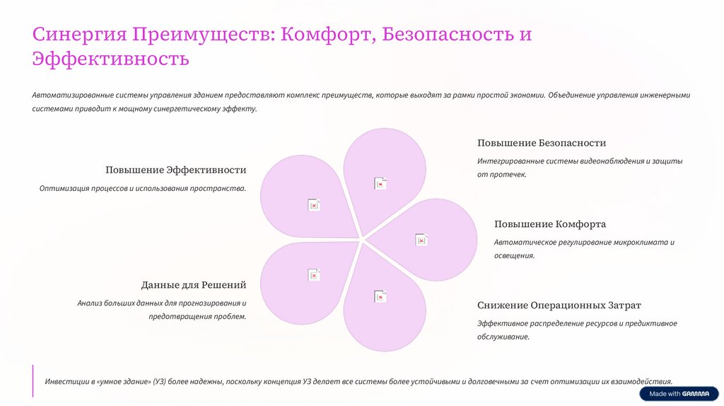 Инвестиции в «умное здание» (УЗ) более надежны, поскольку концепция УЗ делает все системы более устойчивыми и долговечными за счет оптимизации их взаимодействия.