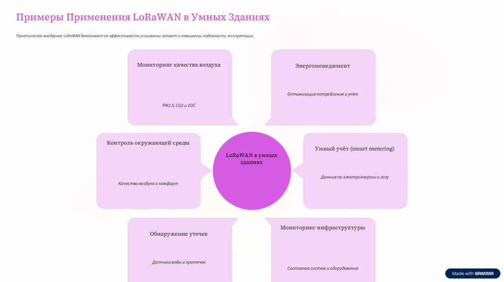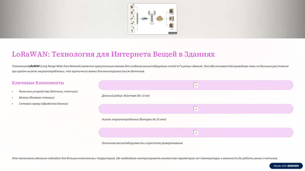 LoRaWAN: Технология для Интернета Вещей в ЗданияхТехнология LoRaWAN (Long Range Wide Area Network) является краеугольным камнем для создания масштабируемых сетей IoT в умных зданиях. Она обеспечивает беспроводную связь на большие расстояния