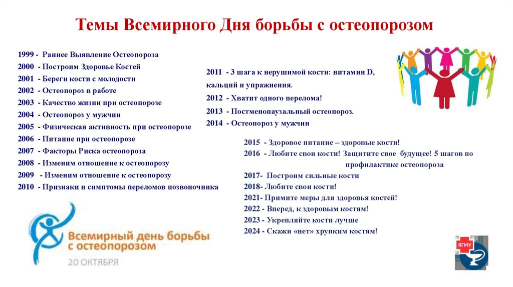 Темы Всемирного Дня борьбы с остеопорозом1999 - Раннее Выявление Остеопороза