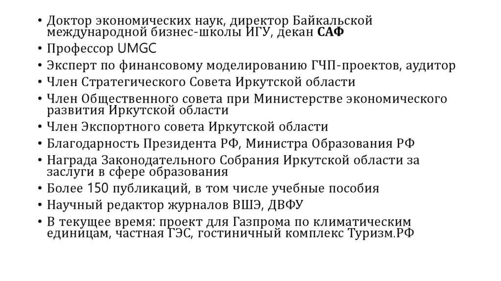 • Доктор экономических наук, директор Байкальскоймеждународной бизнес-школы ИГУ, декан САФ