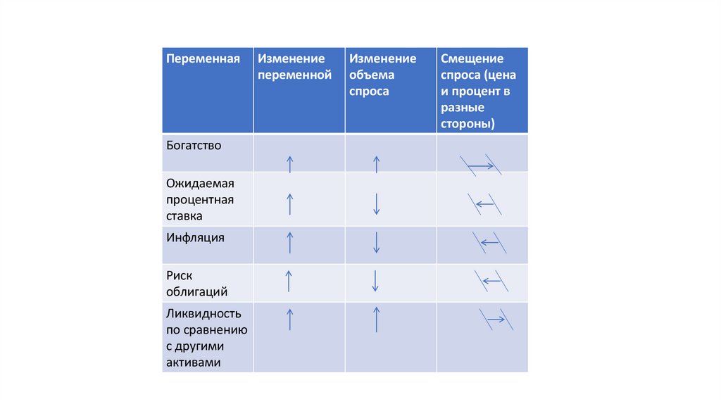 • Чем больше денег – тем больше спрос на активы• В период роста – спрос на облигации ( то есть предложение