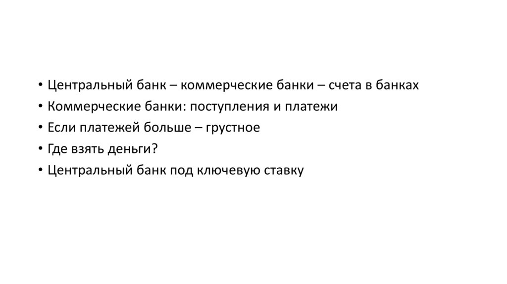 • Центральный банк – коммерческие банки – счета в банках• Коммерческие банки: поступления и платежи