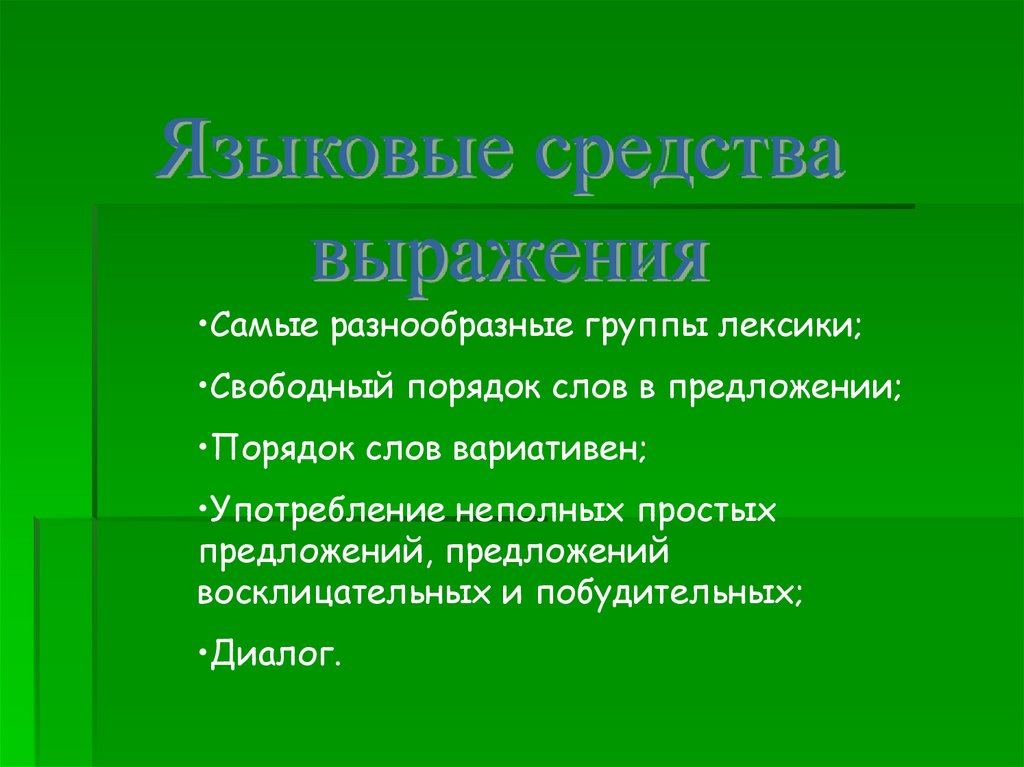 •Самые разнообразные группы лексики;•Свободный порядок слов в предложении;