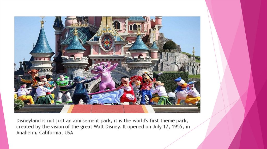 Disneyland is not just an amusement park, it is the world's first theme park,created by the vision of the great Walt Disney. It opened on July 17, 1955, in