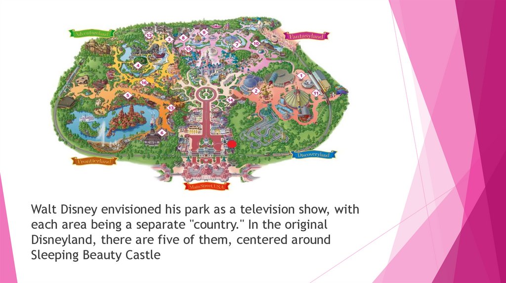 Walt Disney envisioned his park as a television show, witheach area being a separate "country." In the original