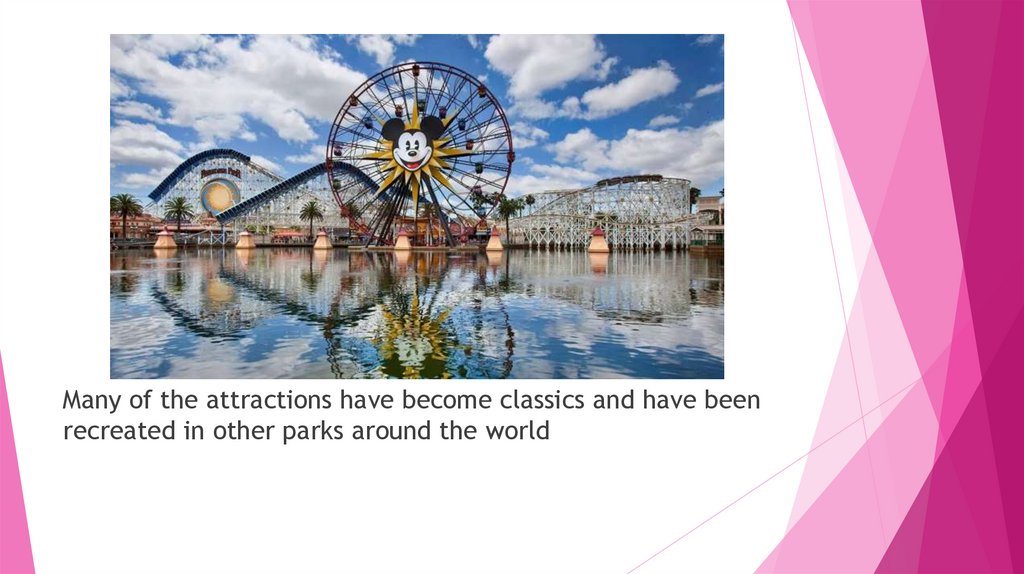 Many of the attractions have become classics and have beenrecreated in other parks around the world