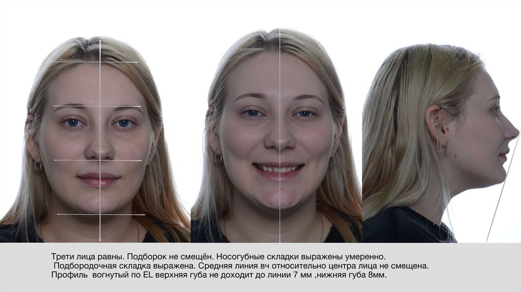 Трети лица равны. Подборок не смещён. Носогубные складки выражены умеренно.Подбородочная складка выражена. Средняя линия вч относительно центра лица не смещена.