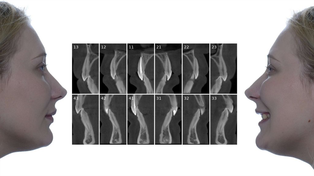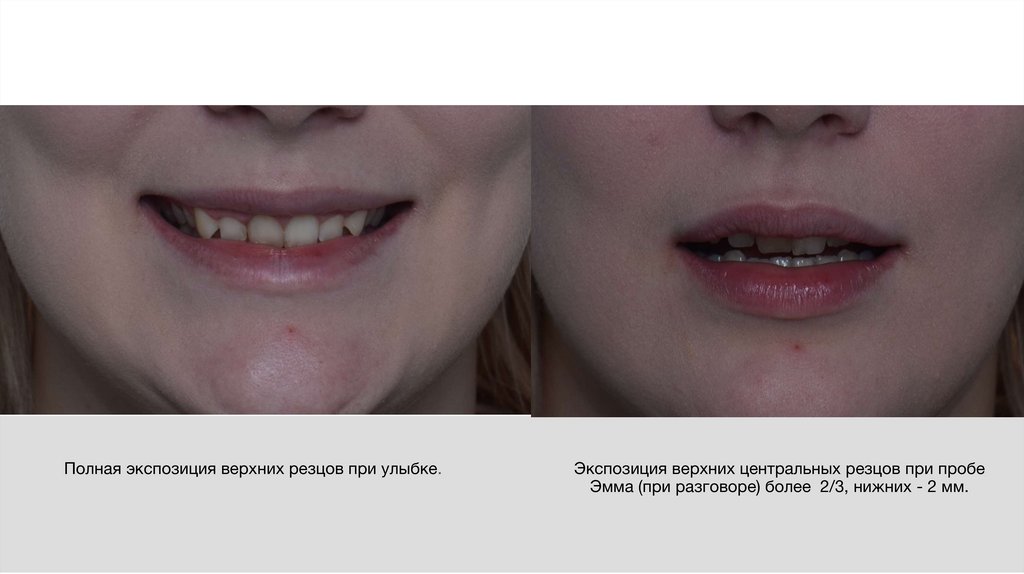 Полная экспозиция верхних резцов при улыбке.Экспозиция верхних центральных резцов при пробе