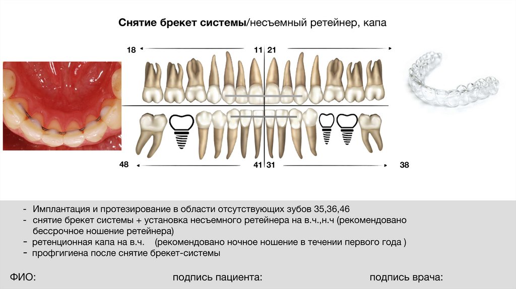 - снятие брекет системы + установка несъемного ретейнера на в.ч.,н.ч (рекомендовано