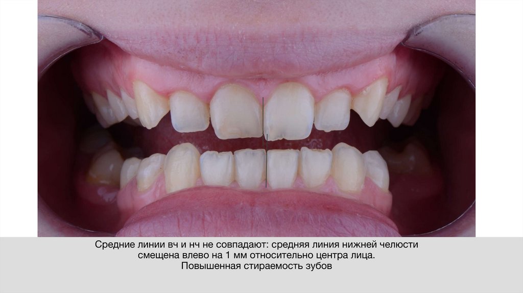 Средние линии вч и нч не совпадают: средняя линия нижней челюстисмещена влево на 1 мм относительно центра лица.