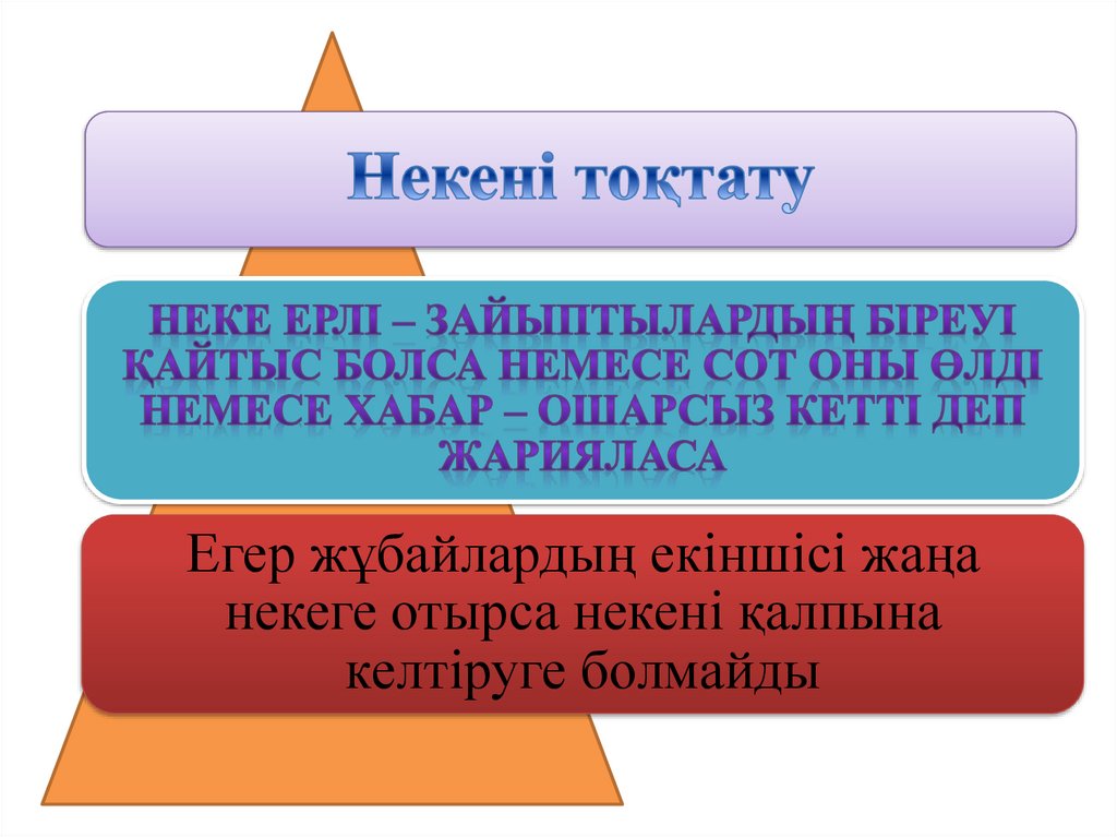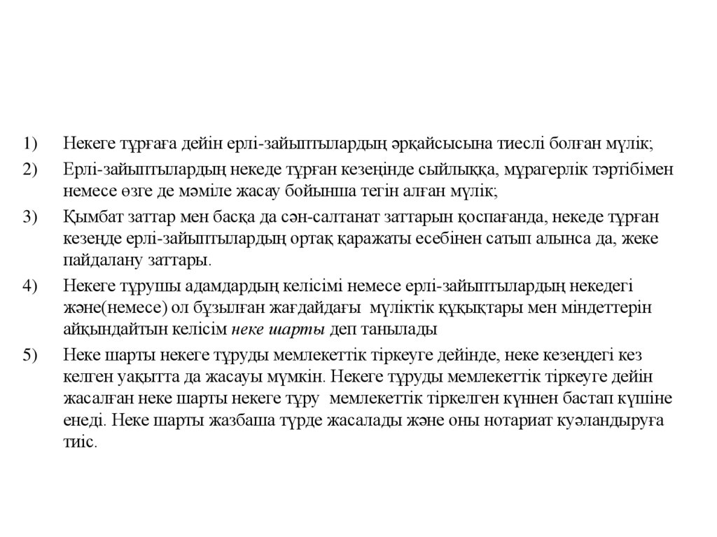 2. Неке – ерлі – зайыптылар арасындағы мүліктік және мүліктік емес жеке қатынастарды туғызатын, отбасын құру мақсаты мен заңдарда