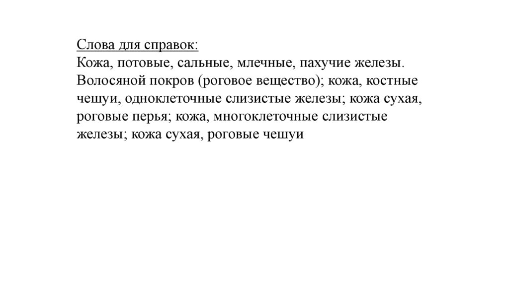 Слова для справок:Кожа, потовые, сальные, млечные, пахучие железы.