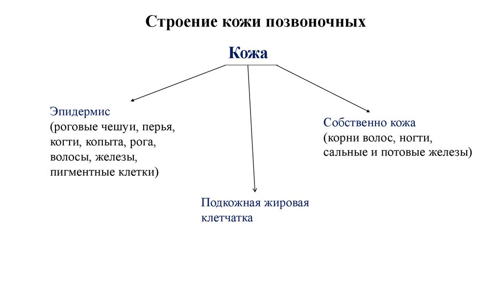 • покров двухслойный: эпидермис и собственно кожа;• эпидермис многослойный (нижний слой – живые, верхний слой клеток –