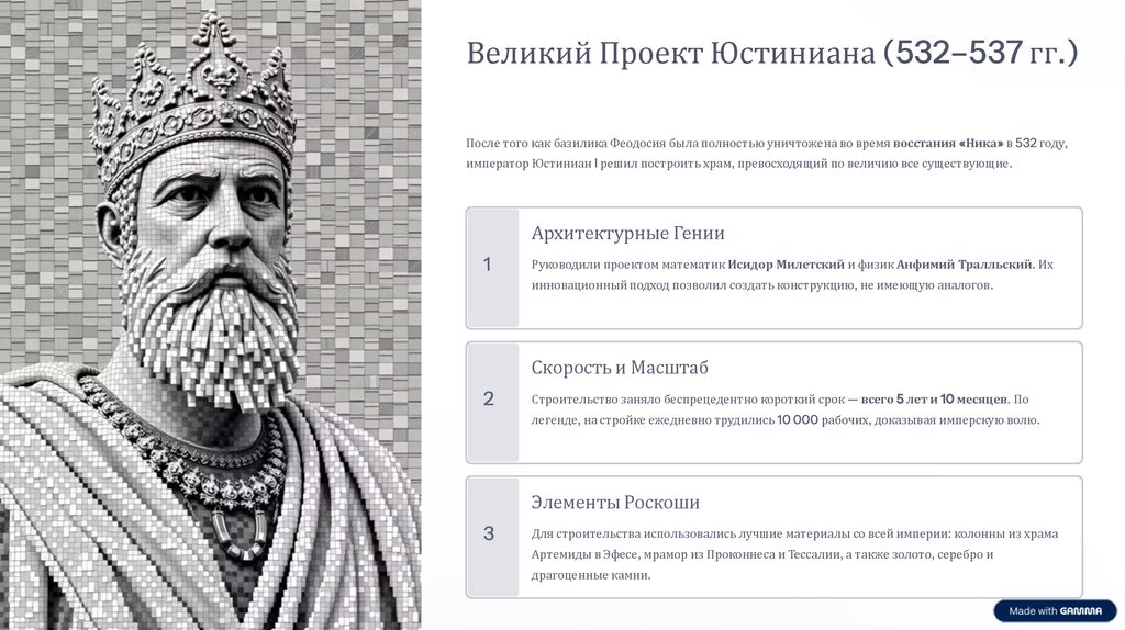 Великий Проект Юстиниана (532–537 гг.)После того как базилика Феодосия была полностью уничтожена во время восстания «Ника» в 532 году,