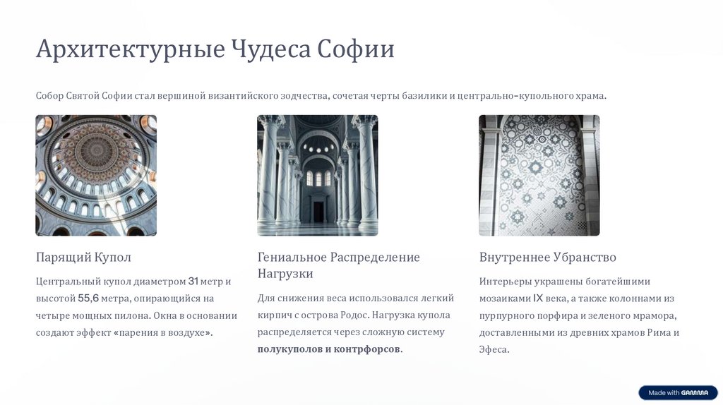Архитектурные Чудеса СофииСобор Святой Софии стал вершиной византийского зодчества, сочетая черты базилики и центрально-купольного храма.