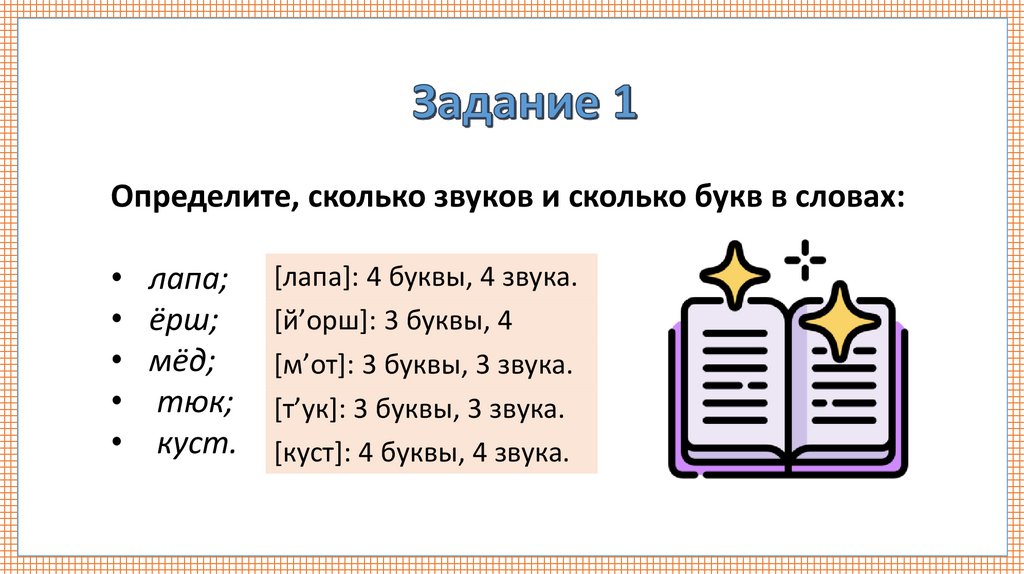 Определите, сколько звуков и сколько букв в словах:лапа;