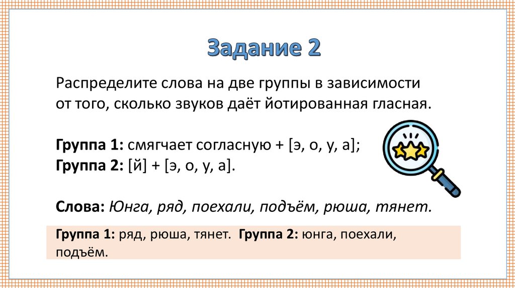 Распределите слова на две группы в зависимостиот того, сколько звуков даёт йотированная гласная.