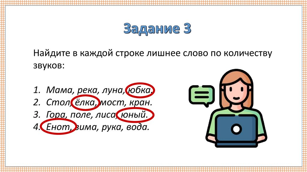 Найдите в каждой строке лишнее слово по количествузвуков: