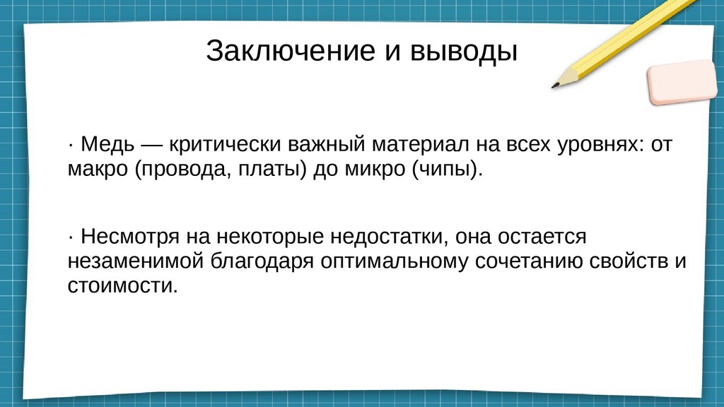 Заключение и выводы· Медь — критически важный материал на всех уровнях: от