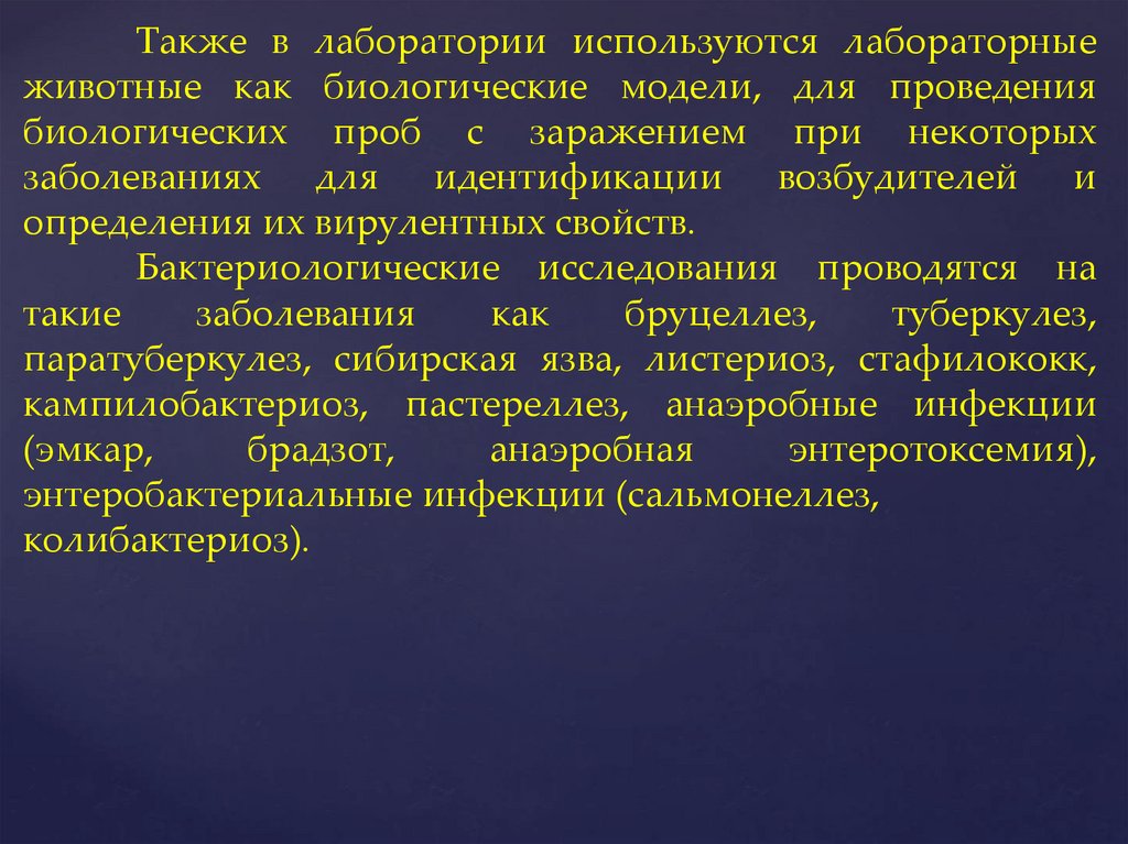 Также в лаборатории используются лабораторныеживотные как биологические модели, для проведения