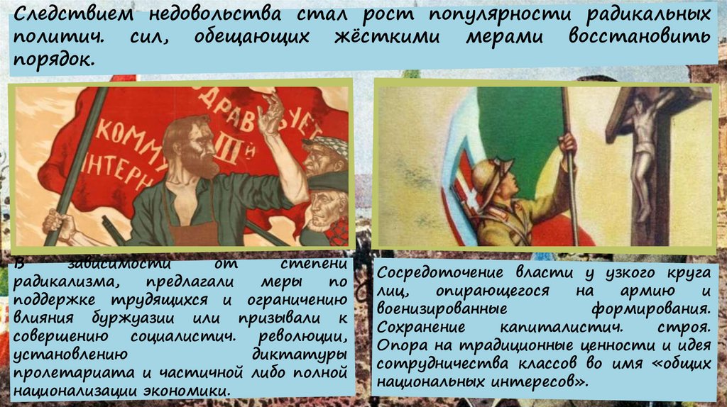 Следствием недовольства стал рост популярности радикальныхполитич. сил, обещающих жёсткими мерами восстановить