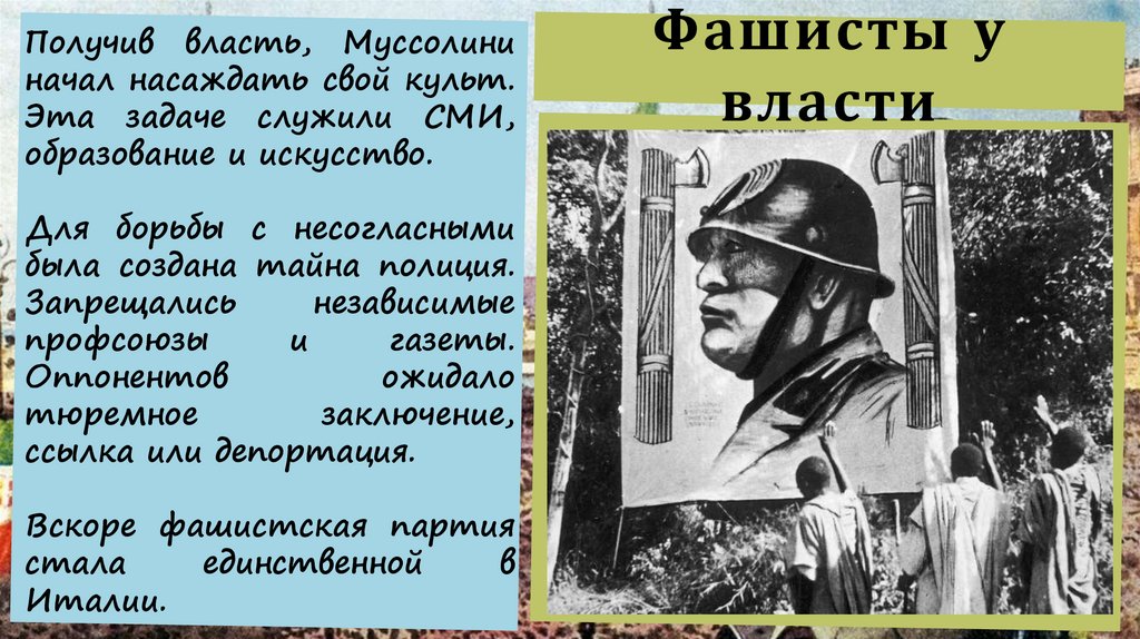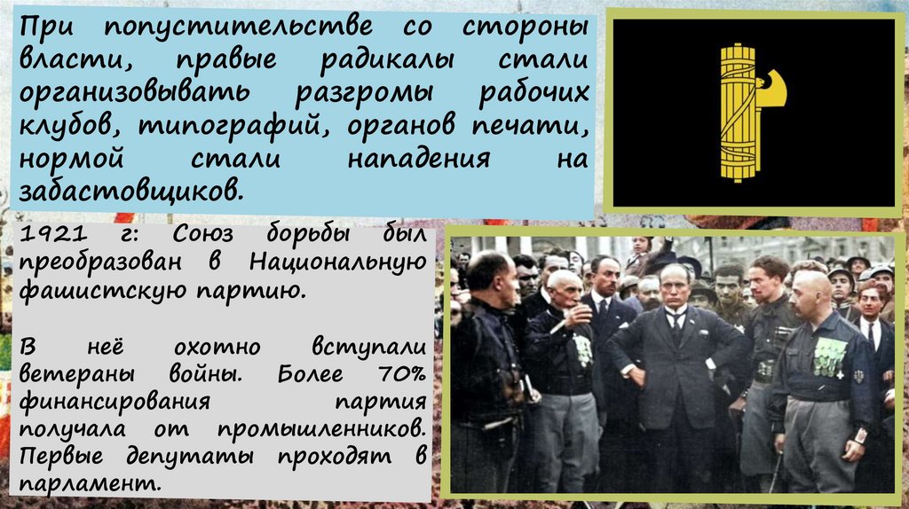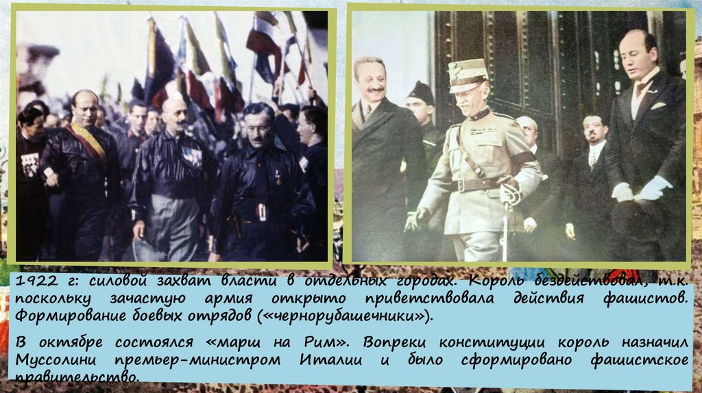 1922 г: силовой захват власти в отдельных городах. Король бездействовал, т.к.поскольку зачастую армия открыто приветствовала действия фашистов.