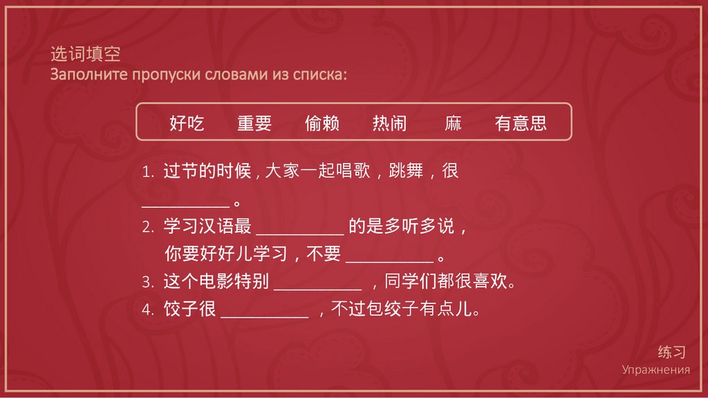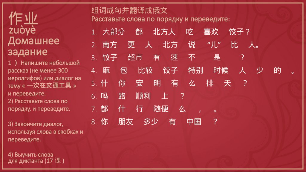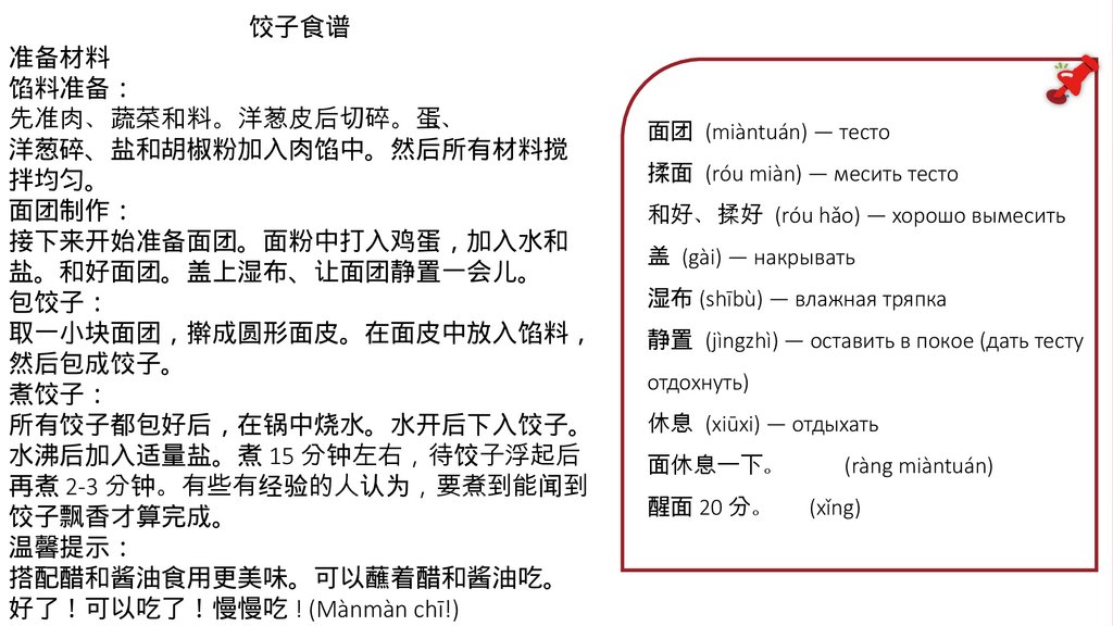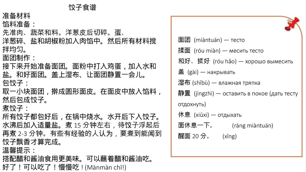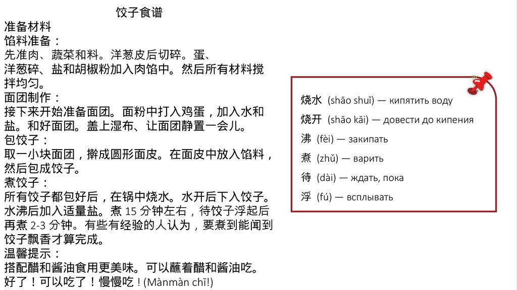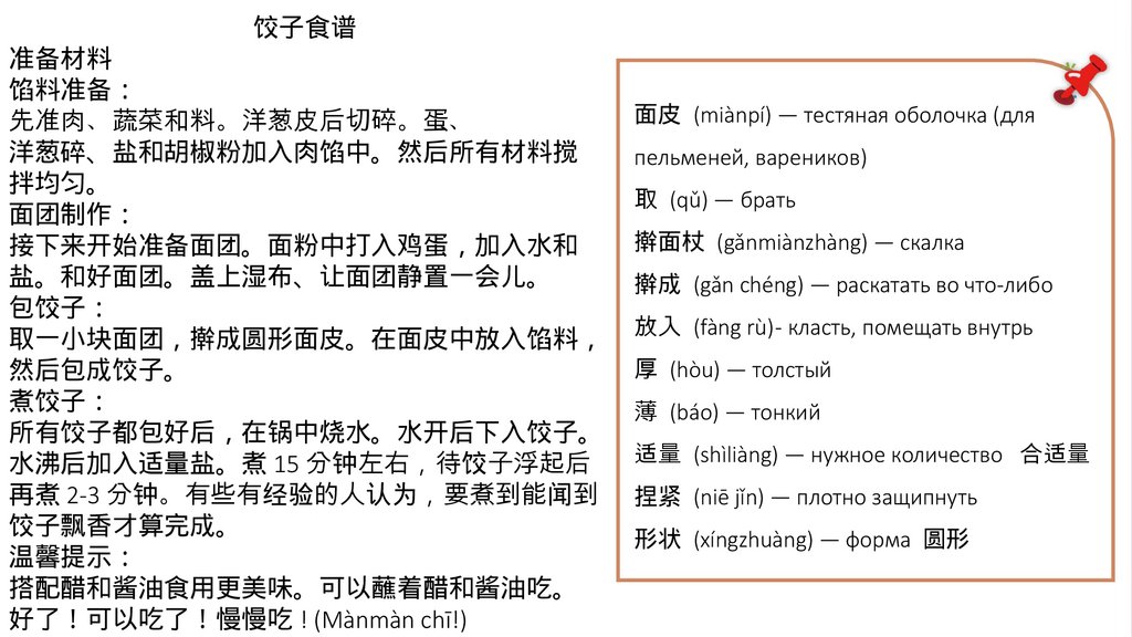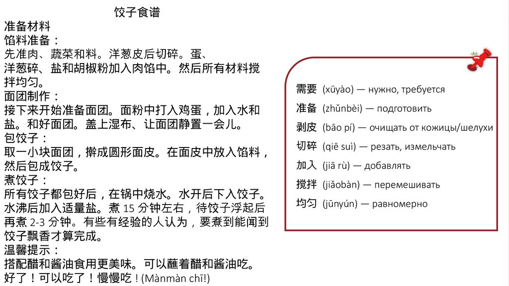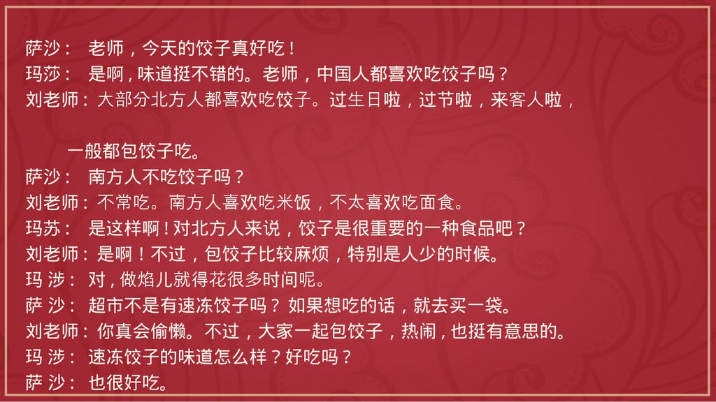Примерная фраза: « 对我们北方人来说 饺子就是一种重要的食品。虽然包饺